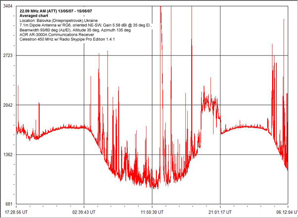 And here you can listen to a high-pitched (2.5 days resampled into 20 seconds) audio of the whole event - two Milky Way galactic transits through the antenna beam. High levels of noise at the beginning and at the end represents a transit. MP3 Audio - 324 Kb.